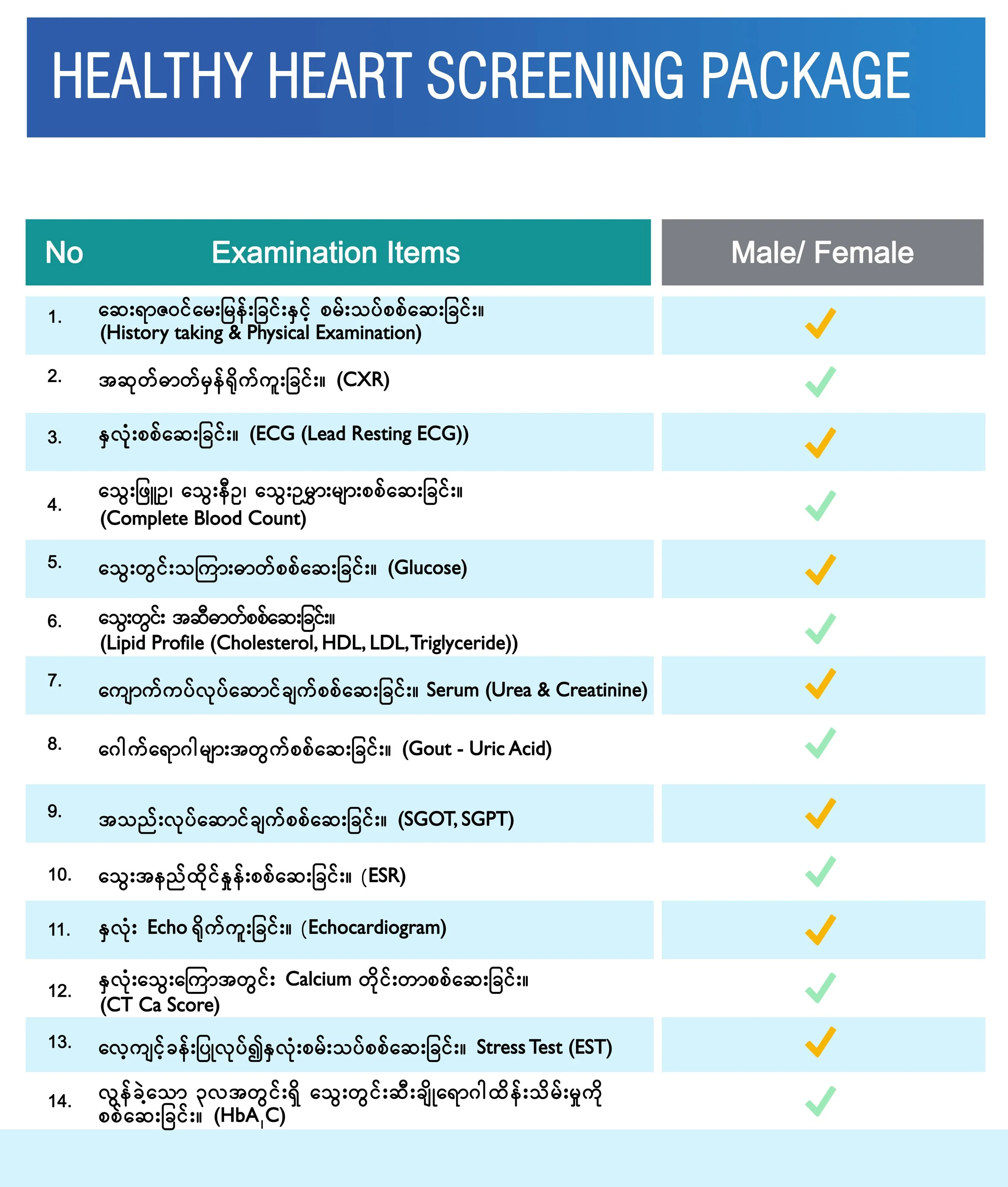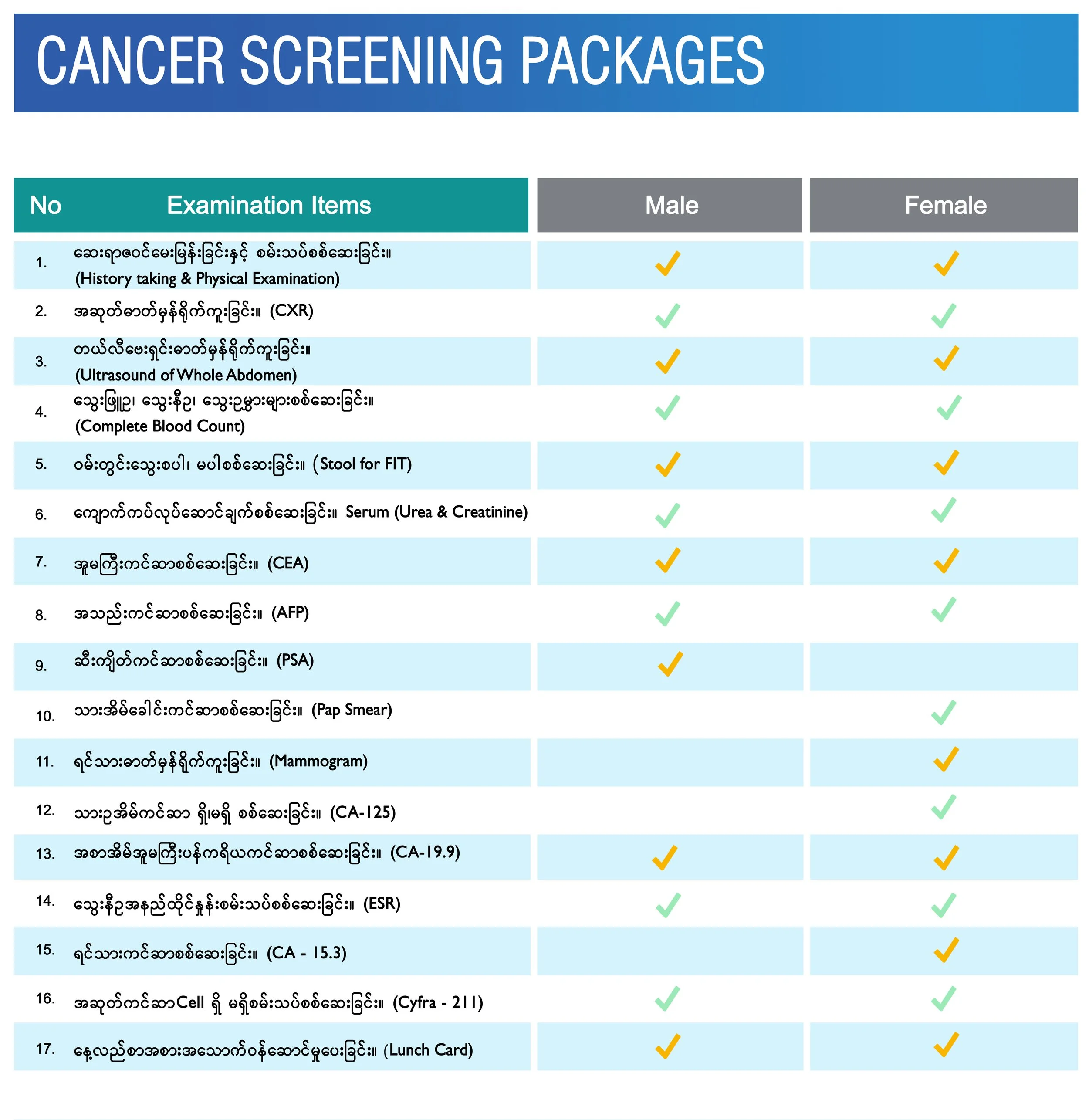 Below is the comprehensive list of medical check-up packages available in Pinlon Hospital. If you would like to know more about our medical check-up packages or simply would like to make a booking, contact us at 09 77777 9003.